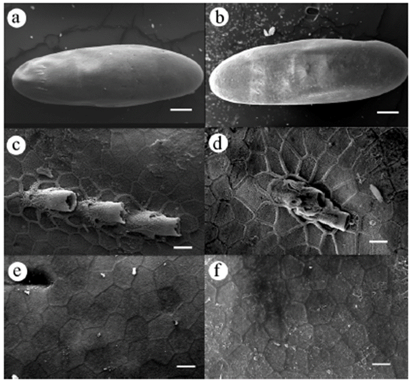 Figura 7 Huevos de Playdecticus. a, c, e) Platydecticus atelcura sp. n.; b, d, f) Platydecticus elguetai sp. n.; a, b) huevo en vista ventral; c, d) micropila; e, f) superficie del corion, en la región media del huevo. Barras de escala: a, b = 200 µm; c-f 20 µm.