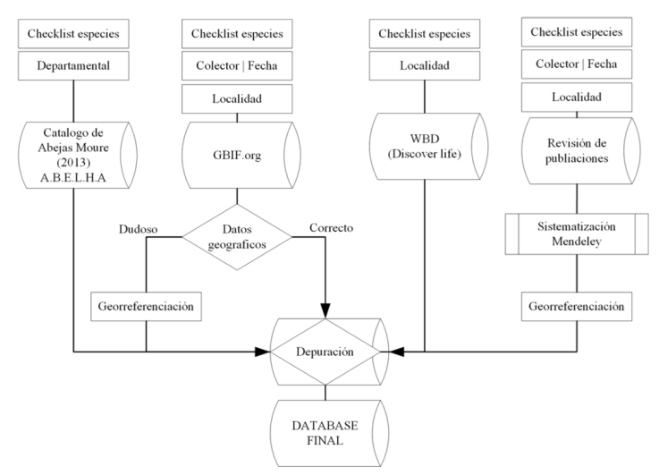 El proceso de recopilación y sistematización de toda la información disponible consistió en generar una lista preliminar como base, información obtenida desde el catálogo de abejas en la región neotropical (Moure et al., 2007) y de la versión online del catálogo de abejas Moure (Melo et al., 2022). Esta información se comparó con bases de datos disponibles en la web, como el sistema de información científica sobre las abejas neotropicales del Brasil conocido como info A.B.E.L.H.A (A.B.E.L.H.A., 2016), Global Biodiversity Information Facility (GBIF, 2022) y la lista de diversidad de abejas del mundo (World Bee Diversity; Ascher y Pickering, 2020). Por otra parte, se ajustó la clasificación sistemática con base en la propuesta reciente realizada por Engel et al. (2023).