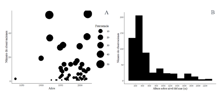 Figura 2 A), Eventualidad de los registros de abejas sin aguijón desde 1984 a 2021; B, número de registros de las abejas sin aguijón en función a la altura sobre el nivel del mar.