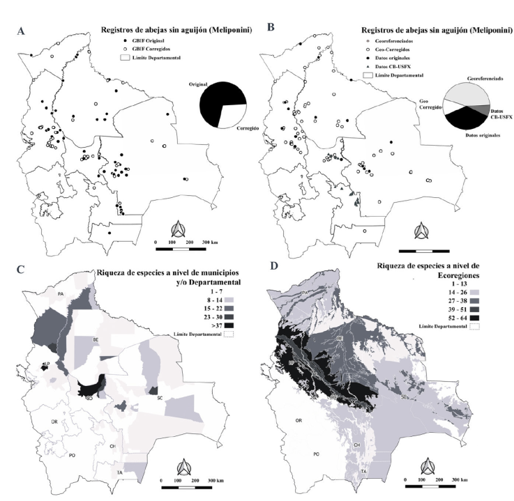 Figura 3 Mapa de ubicación de registros geográficos y riqueza de especies de abejas sin aguijón en Bolivia. A), Mapa con datos corregidos, georreferenciados y originales; B) mapa con registros corregidos de GBIF; C), riqueza de especies de abejas sin aguijón obtenido según los municipios en cada departamento; D), a nivel de ecorregiones de Bolivia. Beni (BE), Chuquisaca (CH), Cochabamba (CB), La Paz (LP), Pando (PA), Santa Cruz (SC), Tarija (TA), Oruro (OR) y Potosí (PO).