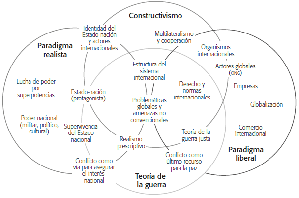 En este paradigma, desde el realismo clásico, el poder nacional de los estados está estrechamente relacionado con categorías como el poder duro (hard power), entendido como la capacidad de un país de influir ejerciendo coerción mediante su poderío militar, o con factores como la influencia política, económica y cultural, según el neorrealismo (Nye Jr., 2004). Por último, el paradigma realista tiende puentes complementarios con el constructivismo y la Teoría de la guerra, para el análisis ecléctico, a la manera del diagrama de Venn, como se observa en la gráfica 2. Estos paradigmas expresan que los conflictos suponen la existencia de vías tangibles y aceptables para que las naciones alcancen su interés nacional y, en consecuencia, se superponen en algunas esferas con el paradigma realista.