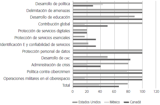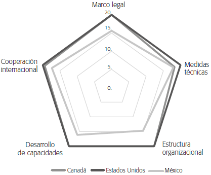 En el marco de las cinco dimensiones de evaluación del GCI, México presenta claros rezagos respecto de Estados Unidos y Canadá. Por ejemplo, Estados Unidos alcanza una calificación de 20/20 puntos en todas, con lo cual se lo considera potencia del ciberespacio. Por su parte, Canadá obtiene la máxima ponderación en las dimensiones de marco legal (20/20), estructura organizacional (20/20) y desarrollo de capacidades (20/20), mientras que en medidas técnicas su desempeño es de 18.2/20 puntos y en cooperación internacional, de 19.4/20 puntos. Por último, México alcanza 15.6/20 puntos en marco legal, 17.9/20 en medidas técnicas, 14.7/20 en estructura organizacional, 16.13/20 en desarrollo de capacidades y 17.3/20 en cooperación internacional, por lo cual muestra un claro rezago respecto de sus socios. Eso implica que tiene un menor nivel de compromiso con documentos como la Agenda sobre Ciberseguridad Global, de la ITU (2004), creada en 2004, que tiene como fin promover el compromiso con la cooperación y el multilateralismo para la gobernanza global del ciberespacio.