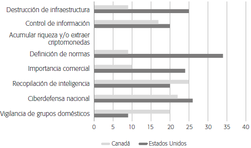 Al comparar a nuestros socios, se encuentra que Estados Unidos supera a Canadá en cinco dimensiones: fortalecimiento y mejora de la ciberdefensa nacional (26 puntos contra 22); creciente competencia comercial cibernética y tecnológica nacional (24 vs. 10); definición de normas técnicas y normas cibernéticas internacionales (34 vs. 9); control y manipulación del entorno de información (20 vs. 17) y destrucción o desactivación de la infraestructura y las capacidades de un adversario (25 vs. 9); no obstante, Canadá lidera en vigilancia y seguimiento de grupos nacionales (25 vs. 9) y recopilación de información de inteligencia en el extranjero, para fines de seguridad nacional (25 vs. 20). Por último, ambos tienen una ponderación de 0 en lo tocante a acumular riqueza y/o extraer criptomonedas.