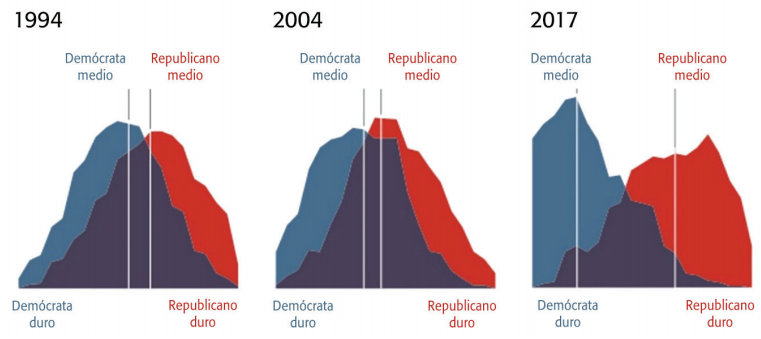 Nota: Consistencia ideológica basada en una escala de 1-10. El área azul representa la distribución ideológica entre los “ligeramente demócratas” y los “demócratas duros”. El área roja representa la distribución ideológica entre los “ligeramente republicanos” y los “republicanos duros”. El gráfico muestra cómo las posiciones ideológicas de ambos partidos, con el paso del tiempo, se van alejando del “centro”, y se van concentrando en los polos opuestos.
