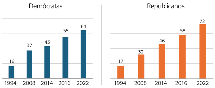 Los cambios demográficos son indispensables para entender esos realineamientos electorales que convirtieron a California en un estado “azul” o demócrata, al tiempo que han hecho de Texas un estado competitivo, con elecciones cerradas. Sin embargo, la variable demográfica no es suficiente para entender esos cambios en el sistema de partidos de ambos estados. Como consecuencia del ambiente de polarización política que vive actualmente Estados Unidos, es necesario tomar en cuenta los cambios ideológicos al interior de los partidos políticos, en especial del Republicano, donde el trumpismo se ha convertido en la corriente dominante.