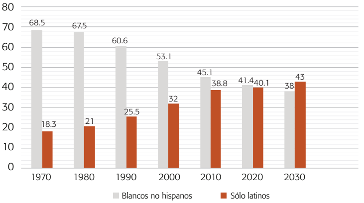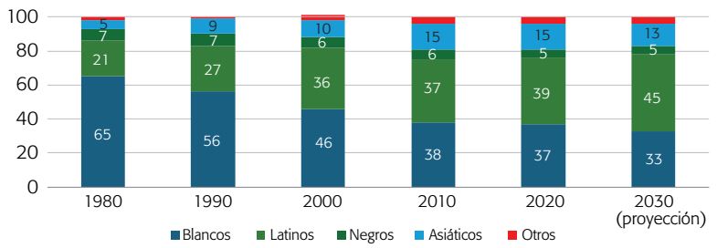 Los datos de los censos del 2010 y 2020 de la Oficina del Censo de Estados Unidos muestran cómo ese país está experimentando un cambio demográfico sin precedentes, donde los sectores denominados “blancos”5 están reduciendo su porcentaje poblacional respecto a otros grupos étnicos, sobre todo el de “latinos” o “hispanos”. Según las proyecciones de la misma oficina del censo, se estima que para el año 2040 la población “blanca no hispana” dejará de ser la mayoritaria, alcanzando solamente el 49.7 por ciento del total de habitantes (Vespa et al., 2020). La proyección demográfica oficial prevé que para el 2030, los “latinos” o “hispanos” serán el 21.1 por ciento del total de la población, dejando muy por detrás a los afroamericanos (el 13.8 por ciento) y los asiáticos (un 6.9 por ciento).