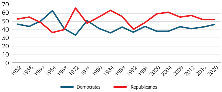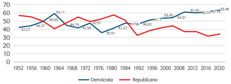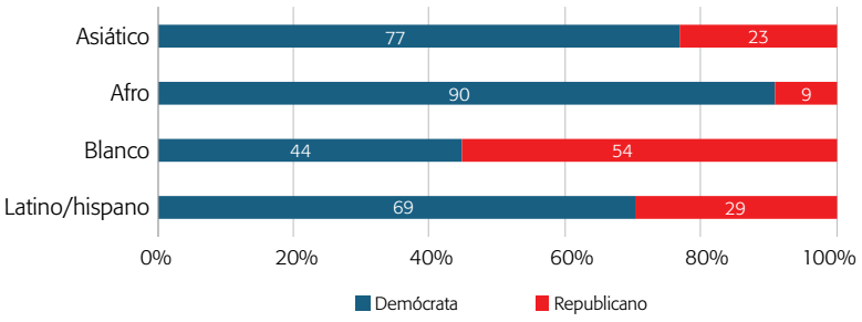 Pero mucho ha cambiado desde entonces. En el 2012, Barack Obama ganó con un porcentaje de “voto blanco” mucho menor que el de previos candidatos demócratas, con sólo el 39 por ciento, en contraste con el más del 90 por ciento del “voto negro” (Zingher, 2014). Posteriormente, Trump demostró que se podía ganar una elección con un discurso abiertamente nativista, que apela a los miedos de los blancos que creen que “están perdiendo a su propio país” (Skocpol y Williamson, 2016: 3). Cada vez más el Partido Republicano es visto como el partido de los cristianos y la clase trabajadora blanca, y el Demócrata como el de las minorías étnicas y las mujeres de clase media con alta escolaridad (Haberman, 2020).