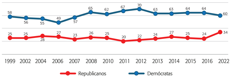 Zachary Neal, profesor de la Universidad de Michigan, ha documentado el com portamiento de cada congresista y senador de Estados Unidos desde 1973 a 2016. Sus hallazgos documentan cómo, cada vez menos, se generan legislaciones como resultado del trabajo y colaboración de ambos partidos. La labor legislativa bipartidista por décadas fue crucial para el funcionamiento del sistema político de Estados Unidos, pero en los últimos veinte años, las iniciativas enviadas por un presidente, sea demócrata o republicano, son rechazadas, en promedio, por más del 96.8 por ciento de los legisladores del partido contrario (Neal, 2020). Por lo tanto, para que una ley, un tratado o un programa se aprueben, no es tanto por negociación, sino por avasallar por mayoría de votos al rival.
