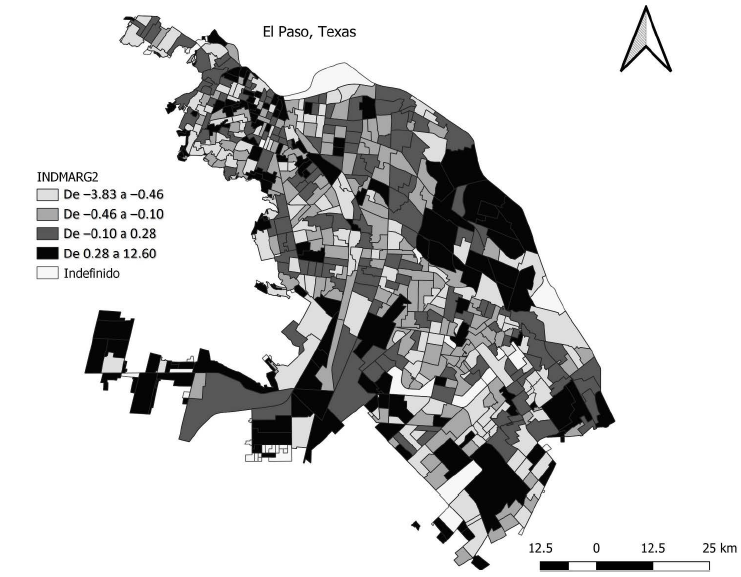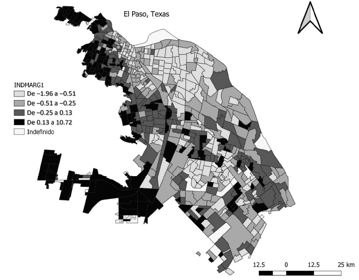 La distribución de los niveles de marginación sigue forma de gradiente desde el nororiente de la ciudad y se incrementa hacia la periferia de esta. En esta zona predominan las áreas geoestadísticas con niveles bajos, y es donde se ubican la línea fronteriza y la cercanía con la ciudad de El Paso. Se puede decir que la distribución de los niveles de marginalidad sigue una forma concéntrica, en particular, por la localización de las áreas geoestadísticas con bajos niveles de marginalidad en las áreas vecinas del nororiente, que están rodeadas por niveles más altos de marginalidad en el norponiente y sur poniente. Estas áreas son asentamientos que surgieron por mecanismos de acceso a suelo informal.