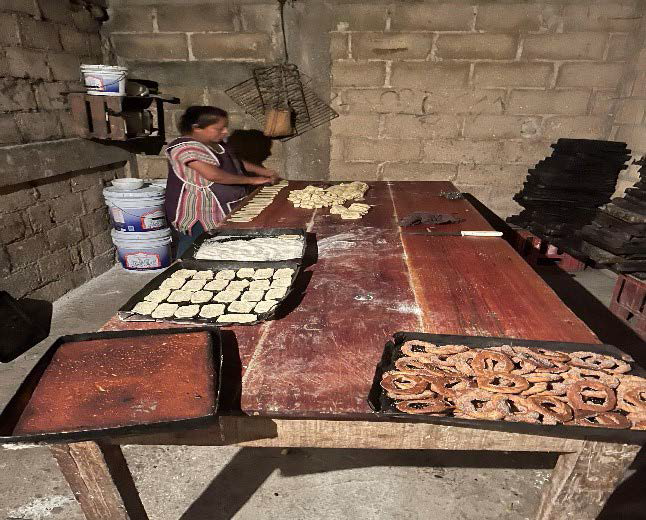Es imposible producir tanto pan, a menos que solo vendas en pequeñas cantidades o al menudeo, pero yo no puedo hacerlo sola. Mis vecinas me ayudan y les pago. Les beneficia porque les doy la oportunidad de ir por sus hijos a la escuela y regresar. Nos apoyamos entre mujeres, pero ellas ya son parte fija del equipo. No contrato a otras. (PA_11. Mayo de 2023)