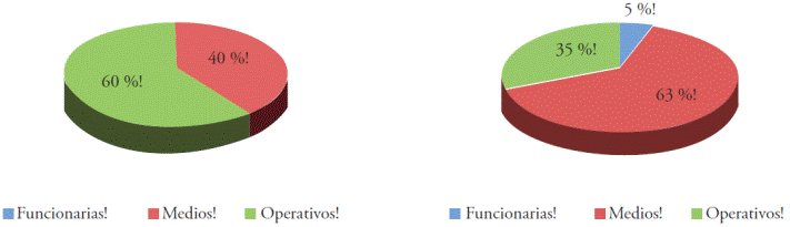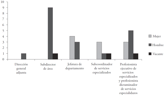 The positions in which the women are concentrated correspond to the lowest. On their part, men are distributed in the totality of the positions, including the coordinations and subdelegations, where the positions that are better paid are found (Figure 4).