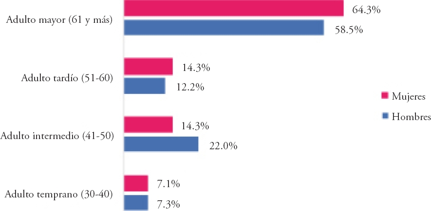 La edad promedio de los beneficiarios, es de 62 años y 25.5%, está conformado por mujeres. La mayor parte de los productores y productoras, son adultos mayores, que a pesar de tener una gran cantidad de actividades dentro del PSV, intentan cumplir con todas. La distribución de edades en relación al género, muestra una tendencia similar de adultos mayores, tanto en mujeres como en hombres (Figura 2).