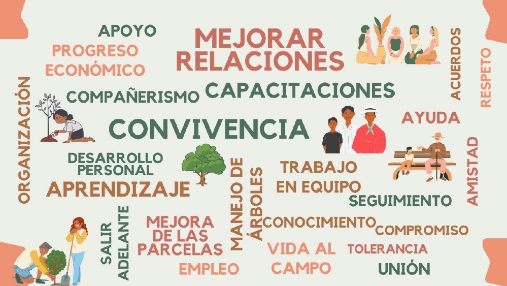Las CAC, han favorecido las relaciones, convivencia e interés de los beneficiarios por diferentes aspectos del programa, por lo que los beneficiarios, señalaron diferentes objetivos de su participación, como la convivencia y mejorar relaciones (27.9%) y capacitaciones y aprendizaje (19.7%) y el resto, son menos importantes. En la Figura 4, se observan los objetivos de las CAC manifestados por los beneficiarios. El tamaño de la letra, define la importancia. Los integrantes de las CAC, ya se conocían; varios, hasta eran familiares, pero sé observó que en las reuniones y las actividades que realizaban en la CAC, que las relaciones entre los miembros, permitieron mejorar las relaciones que ya tenían previamente. Un ejemplo del mejoramiento de las relaciones sociales, es que los integrantes del CAC, se organizan para preparar el desayuno en cada reunión, con o sin los técnicos, y en ocasiones, pueden preparar juntos en desayuno en las instalaciones del CAC o cada quien lleva algo para compartir. Se observó durante las reuniones, que existía gran camaradería y amabilidad entre los miembros del CAC, sin embargo, no podemos determinar si de forma cotidiana, así es la convivencia o así se comportan por la presencia de los investigadores.