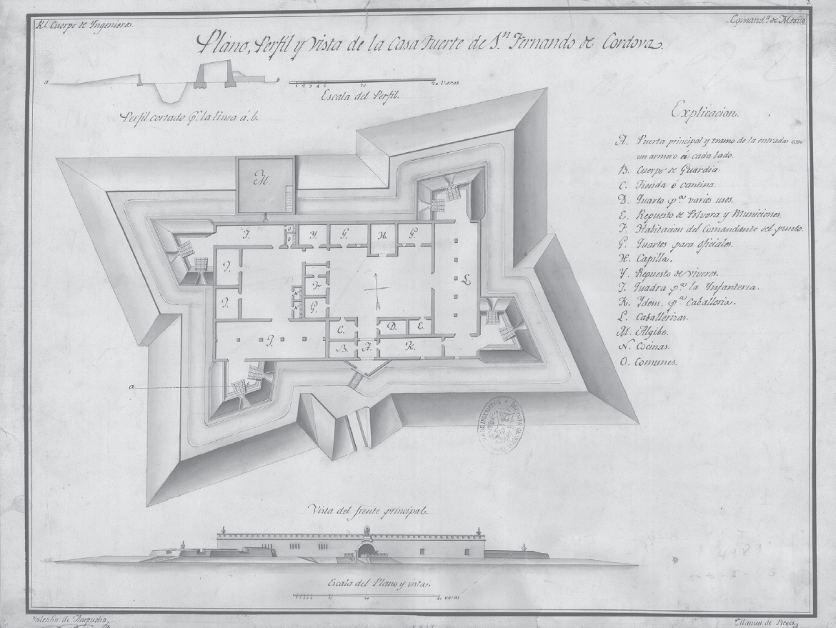 Figura 2 “Plano, perfil y vista de la casafuerte de San Fernando de Cordova”. Autores: Valentín de Ampudia y Manuel de Reyes, 1817. España. Ministerio de Defensa. Instituto de Historia y Cultura Militar-Archivo General Militar de Madrid. Mex-5/9.