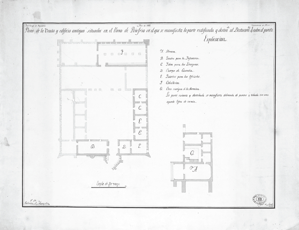 Figura 3 “Plano de la venta y edificio contiguo situados en el llano de Río Frío en el que se manifiesta la parte reedificada y destinada al destacamento que cubre el punto”. Autor: Rafael de Lara, 1817. España. Real Academia de la Historia. Número de control: RAH20101000111.