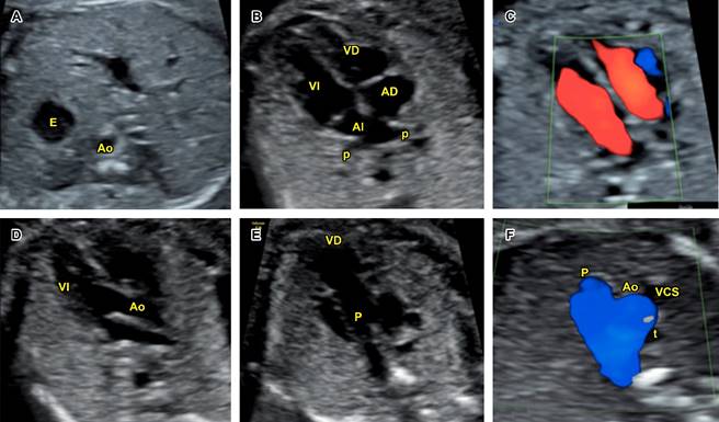 Figura 2: Evaluación cardiaca fetal básica en segundo y tercer trimestre: A) corte de abdomen superior; B) corte de cuatro cámaras; C) corte de cuatro cámaras con Doppler color; D) tracto de salida del ventrículo izquierdo; E) tracto de salida del ventrículo derecho; F) corte de tres vasos y tráquea con Doppler color.