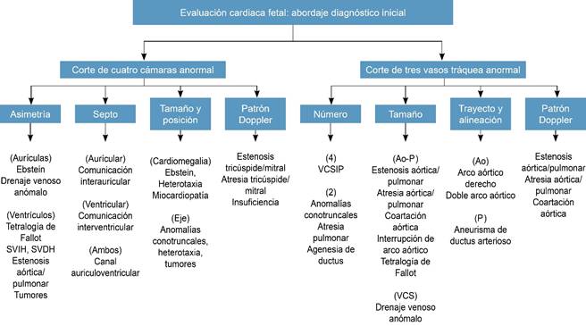 El abordaje prenatal de cardiopatías inicia con una evaluación cardiaca básica en cada trimestre, y ante sospecha de anomalía o factores de riesgo adicionales se realiza una evaluación cardiaca fetal avanzada.3