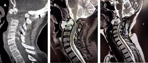 Figura 1: Imágenes de resonancia magnética en cortes (A) sagital y (B) axial que muestran lesión lítica de odontoides y cuerpo del axis. C) Radiografía simple lateral de columna cervical en la que se observa fijación posterior occipitocervical.