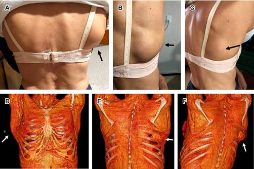 Figura 1: A-C) Fotografías clínicas de femenino de 60 años de edad, en las cuales se muestra masa tumoral en región periescapular derecha. D-F) Imágenes de tomografía computarizada en 3D, se evidencia localización de masa tumoral periescapular derecha.
