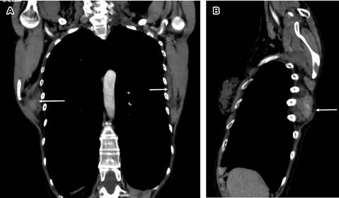 Figura 2: Imágenes de tomografía computarizada en cortes coronal (A) y sagital (B), se observa masa tumoral periescapular derecha con dimensiones de 7 × 5 cm que desplaza escápula hacia afuera y arriba, además de masa tumoral periescapular más pequeña en escápula izquierda.