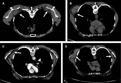 Paciente femenino de 60 años, ama de casa, acude por presentar abultamiento de cinco años de evolución en región escapular derecha, que le ocasiona discreta molestia al efectuar limpieza en el hogar. A la exploración se observa masa de consistencia ahulada en ángulo inferior de escápula derecha prominente, con dimensiones de 7 × 5 cm (Figura 1A-C), no dolorosa al movimiento, con sensación de frote a los desplazamientos de ambas escápulas, con arcos de movilidad de hombros completos y sensibilidad normal; el resto de la exploración es normal. Con diagnóstico presuntivo de elastofibroma dorsi. Se solicita tomografía computarizada (Figuras 1 a 3) que confirma elastofibromas dorsi bilaterales; se propone cirugía, la cual rechaza.