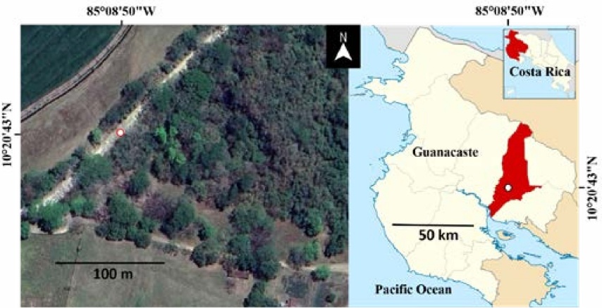 We conduct wildlife monitoring and bird surveys at the Taboga Forestry Reserve in San Miguel, Cañas county (Fig. 1), Guanacaste, as well as in its surrounding buffer area. The reserve lies within the tropical premontane moist forest, at the basal transition life zone (Holdridge 1967). Annual rainfall in this zone ranges from 1,200 to 2,200 mm, with mean temperatures between 23ºC and 24ºC (Bolaños et al. 2005). The area experiences a distinct dry season lasting 3.5 to 5 months, from December to May, followed by a rainy season from June to November (Bolaños et al. 2005). Adjacent sites to the reserve are primarily dedicated to agriculture, with sugarcane and rice as the main crops (Astorga and Mora 2022).