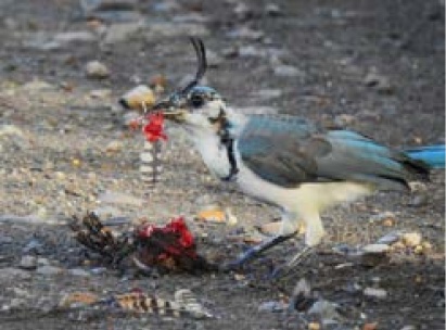 The White-throated Magpie-Jay (Cyanocorax formosus) is a versatile omnivore and opportunistic predator (Langen and Berg 2016, Echeverri et al. 2019, Fielding et al. 2020). Diet of the species includes caterpillars, katydids, roaches, beetle grubs, small amphibians and lizards, fruits, seeds, bird eggs, and nestlings (Stiles and Skutch 1989). The species also consumes crops such as maize and it feeds on nectar from balsa tree blossoms (Stiles and Skutch 1989). Unlike many other corvids, the White-throated Magpie-Jay does not engage in food caching (de Kort and Clayton 2006). This study documents the opportunistic scavenging behavior of the White-throated Magpie-Jay on a bird carcass killed by a vehicle in northwestern Costa Rica, providing new insights into the dietary flexibility of this species.