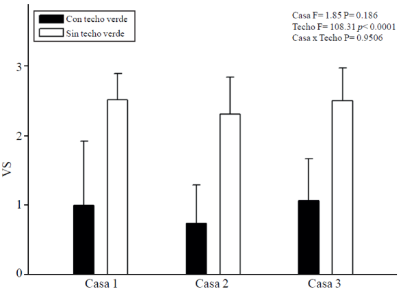 The average resident SV group was 0.63 and 2.23, for the rooms with and without green roof, respectively, significant differences were detected due to the type of roof and between houses (Figure 3); SV the average visitor group was 0.94 and 2.44, for the rooms with and without green roof, respectively, with a statistically significant difference (Figure 4). It is possible that, unlike the visiting group, the resident was able to detect small environmental differences between the houses, being more familiar with their homes. Also, both the APV as PPU, corresponding to the two reviewers group, were significantly lower in rooms with green roof, than in those without it (Figures 5 and 6), showing a lack of near unanimous comfort, according PPU, in rooms without green roof.