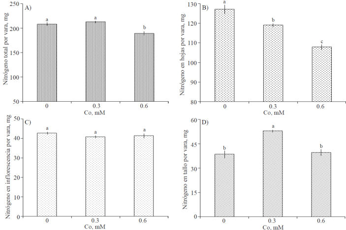 The total N content in floral stem showed a significant reduction with treatment consisting of 0.6 Mm (Figure 5A). Also, leaf N content was significantly reduced when the rods were treated with Co; observing a negative relationship between it and the Co concentration supplied (Figure 5B). The N content in inflorescences was not statistically different between treatments (Figure 5C). The amount of N in stems, was statistically superior when floral stem were treated with 0.3 mM of Co (Figure 5D).