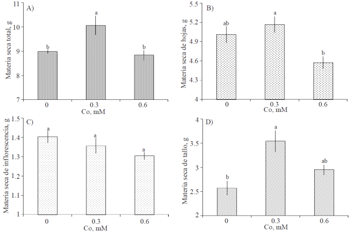 | Cobalto, mM | Hojas | Inflorescencia | Tallo |