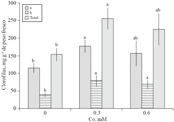 Figure 4 Foliar concentration of chlorophyll a, b and total in gladiola rods treated for 10 days in a vase with different concentrations of cobalt. Mean ± SD with different letters in each variable indicate significant differences (Tukey, p≤ 0.05) between treatments.
