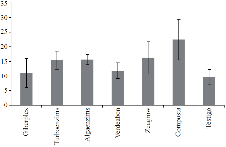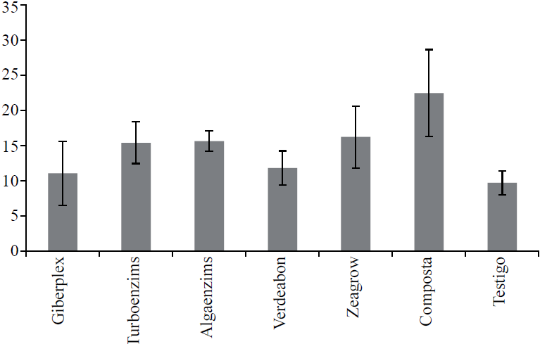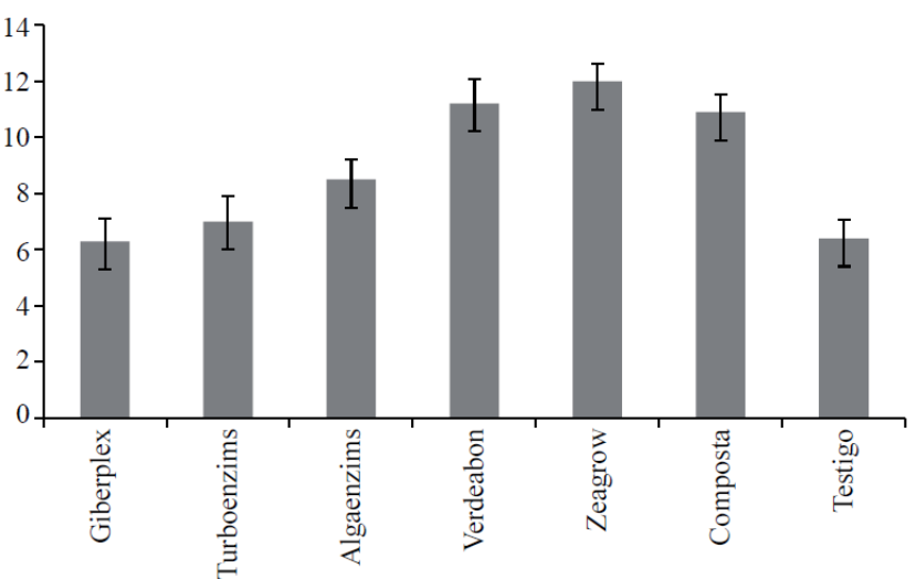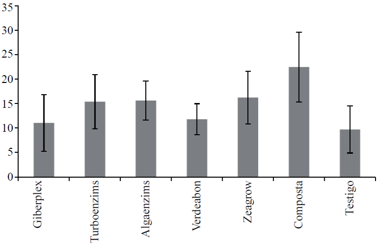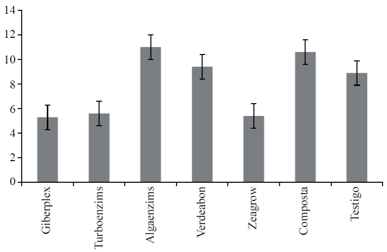 In the statistical analysis, there is a significant evidence with α= 0.05, which at least one treatment causes a different effect on the number of outbreaks issued by M. paniculata (F= 10.85, Pr <0.0001). It was observed that three treatments induce a similar effect, while the remaining four different forms behave. This can be seen by comparing Tukey where Zeagrow, Verdeabon and compost are the best treatments (Table 2).