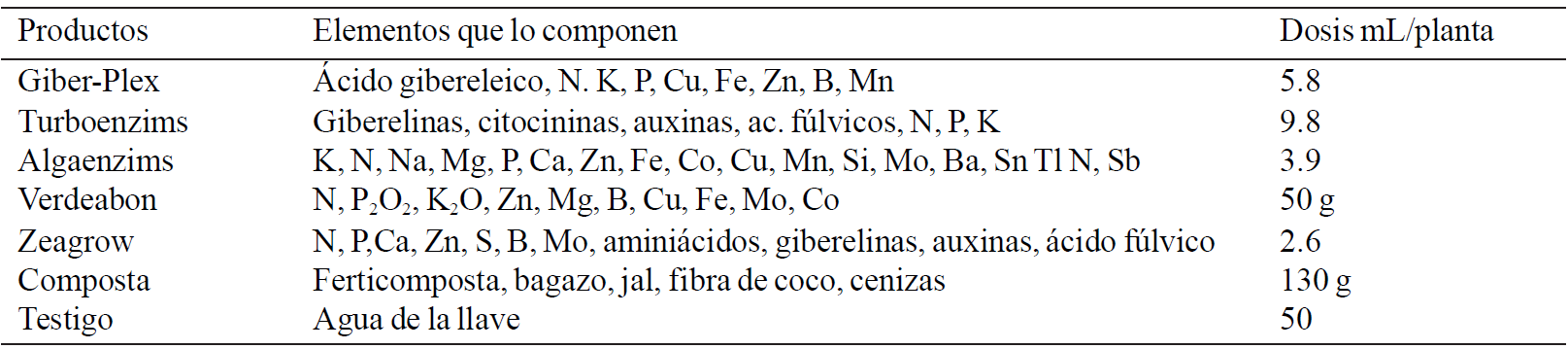 To develop the work is first made an apical and lateral pruning M. paniculata to stimulate sprouting. Pruning quickly, the products were applied directly to the soil to evaluate liquid except that Verdeabon compost and were applied as a solid product. Doses and evaluated products are listed in Table 1.