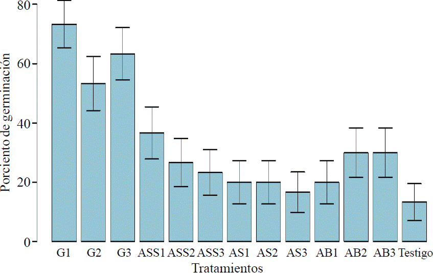 Regarding organic acids the ASS treatment showed the highest average in germination (X= 28.88), followed by AB (X= 26.66), and the lowest average AS (X= 18.88). Note that although IVG (Figure 3) were lower, germination with organic acids initiated the first day after sowing. Organic acids derived from the metabolic pathway of phenylpropanoid compounds such as plant hormones involved in the intracellular signaling cascade and control the production of secondary compounds that work as plant defenses (Álvarez and Espinosa, 2004).
