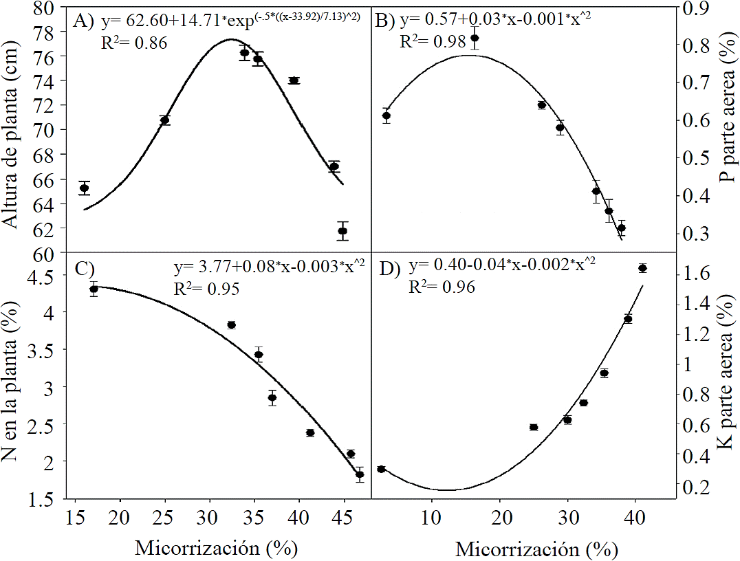 The highest plant height was between 30 and 32% of mycorrhization (Figure 5A) and the highest concentration of P in shoot was with 15% of mycorrhization (Figure 5B); however, when the percentage of this was above 35% and 20%, respectively, both tended to decrease. Also, the increase in mycorrhization was associated with a decrease in the concentration of N (Figure 5C), while the concentration of K is higher with increasing percentage of mycorrhization (Figure 5D). So our results are consistent with Kalyanne-Fernandez (2010) and George et al. (1995).