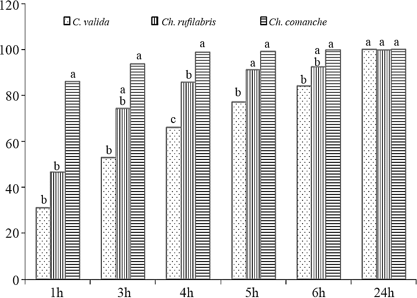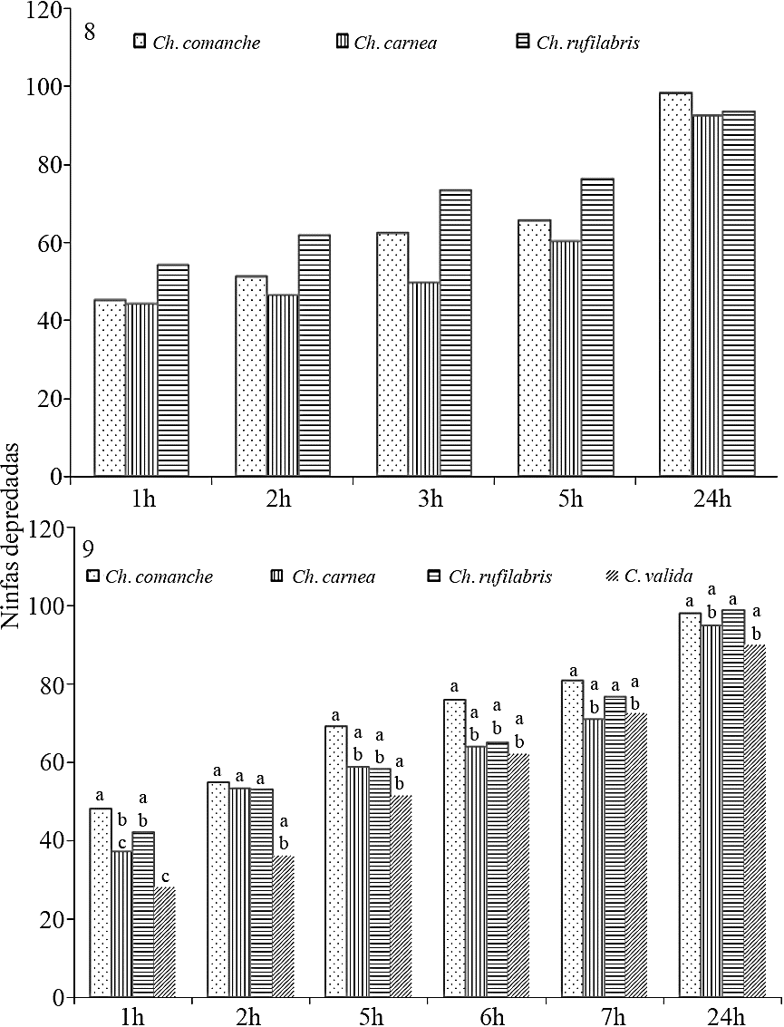 The only assessment girls nymphs (first and second instar) with Ch. rufilabris, Ch. comanche and C. valida, significant difference (p< 0.001) was obtained in the first five readings of predation. Girl consumption D. citri nymphs was significantly different between Ch. comanche and Ch. valid in the first five readings mortality.; and about Ch. comanche and Ch. rufilabris significant difference in consumption of nymphs in the first and third reading predation. Ch. comanche consume 99 specimen of D. citri to four hours of exposure (third reading) of dams The three species preyed nymphs girls total 24 h of exposure (Figure 7).