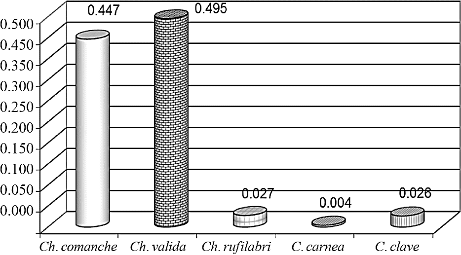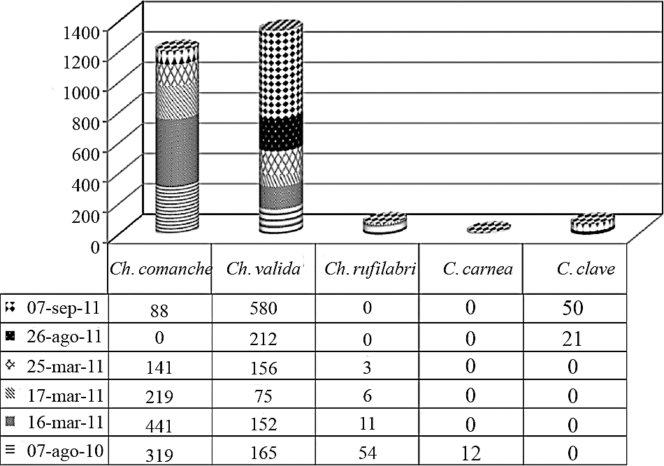 Species identification. In the first three dates grouped catches, august 7, 2010, 16 and 17 march 2011, Ch. Comanche was the predominant species (Figure 1), while the dates of march 25 and august 26, and on september 7, 2011, C. valid was the most abundant. Ch. Carnea and C. Claveri were the rarest species, the first one occasion captured on the first sample and the second in the last two dates and places of capture. The results of the ANOVA showed significant difference in the prevalence of C. valid and Ch. Comanche about Ch. Rufilabris, C. Claveri and Ch. Carnea (p< 0.0004). Whereas in the calculation of the relative abundance of each species, C. validates showed nearly half of the total captured specimens (0.495), followed closely by C. Comanche (0447), together accounted for 0.942 of relative abundance; all other species in total amounted to only 0.057 (Figure 2).