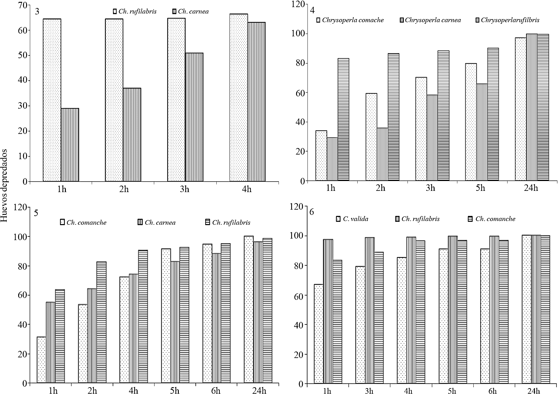Stage II. Capacity assessment predation Ch. carnea, Ch. rufilabris, Ch. comanche and C. valida. In four tests predation on eggs of D. citri no significant difference between treatments (p> 0.05) was detected; however, in all tests Ch. rufilabris showed increased consumption of dams in the early hours of exposure, after five or six hours had consumed 90% or more of the available eggs. In the second test, Ch. Comanche consumed more than Ch. Carnea in the first four readings predation (Figure 4). In the third evaluation Ch. Carnea consumed more egg in the first three readings of predation compared to Ch. Comanche (Figure 5). In the latest assessment of egg predation Ch. Comanche, it predated C. valid only in the first five readings (Figure 6). Lacewing evaluated species consumed nearly all of D. citri eggs before or 24 h exposure (Figures 4, 5 and 6).