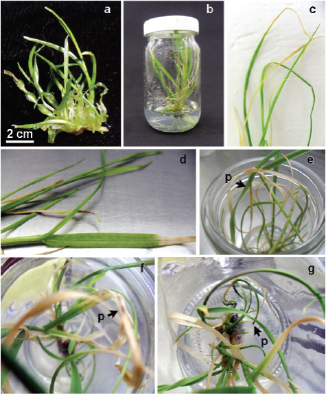 Figure 1 Organogenesis wheat "Atred", "Elinia 48" and "Mirlo 26 " and response and in vitro plants acclimated to rust. (a) regenerated plants via direct organogenesis genotype "Atred"; (b) inoculated seedlings genotype "Atred"; (c and d) freckling of white on the leaves; (e) rust pustules on genotype "Mirlo 26"; (f) leaf death in genotype "Atred"; and (g) pustule at apex of leaf genotype "Elinia 48". p= rust pustule.