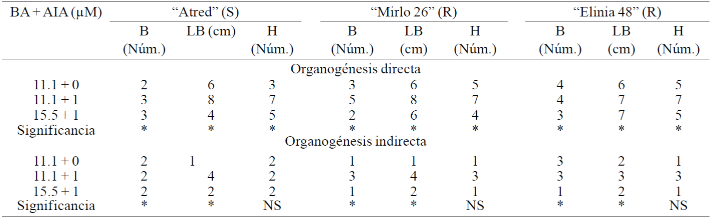 The BA is widely used for multiplication in vitro cereal because it stimulates the formation and shoot length and the number of sheets (Patiño, 2010); cereals such as rice and barley stimulates proliferation of sprouts (Patiño et al., 2007). The response of the three genotypes of wheat to the cytokinin was different; 11.1 μM of BA with the number of buds, leaf length and number of leaves increased considerably. The addition of AIA affected the number of outbreaks, since the combination with BA produced a greater response variables organogenesis. The effect cytokinins and auxins in of morphogenesis in vitro is different between species and varieties, it has been suggested that endogenous levels in the plant also influence morphogenic responses in vitro (Britto et al., 2003).