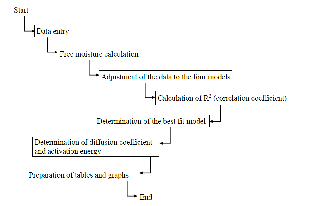 Using a program developed in Matlab, whose operation is described in Figure 2, allowed to find the model that best describes the behavior of its drying kinetics, using the correlation coefficient (R2) as the main criterion to select the best fit.