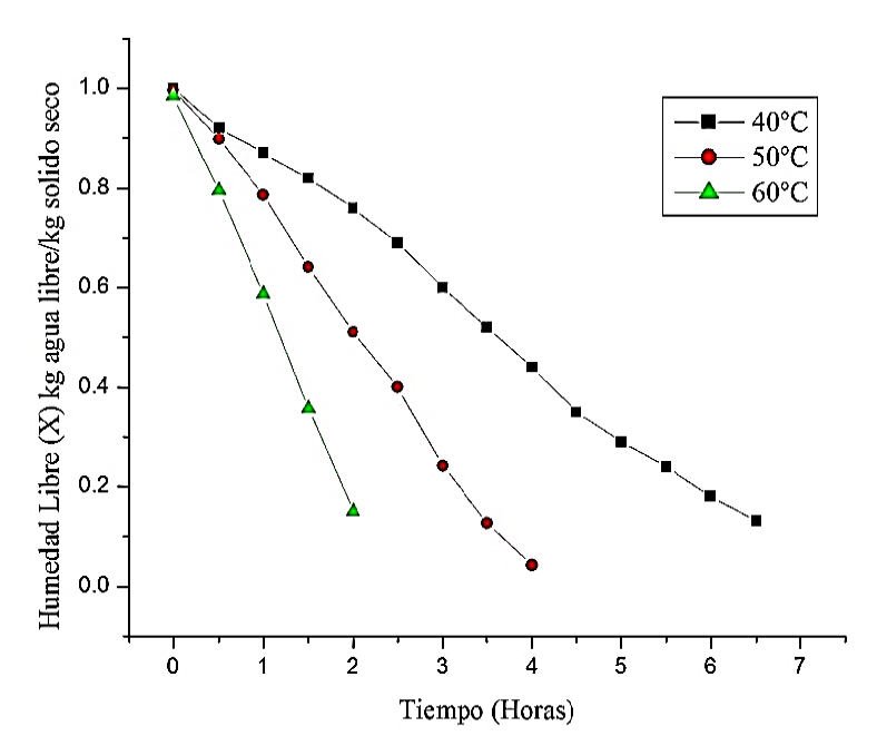 The Moringa oleifera presented an initial humidity of 70.3%. In the Table 2 shows the drying time and free humidity for the study temperatures. These results coincide with the relationship between high temperatures and shorter drying times.