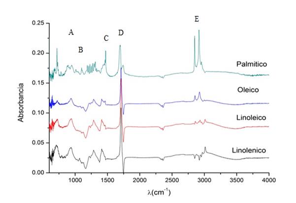 Figure 4 shows the spectrum of palmitic, oleic, linoleic and linolenic fatty acid standards, determined. In this way, the purity pattern of the standards was confirmed and allowed to compare them with the oil samples of the species studied. It is observed, for example, that the palmitic one expresses in the fingerprint seven peaks located in the region 1 187-1 319 cm-1 that differentiate it from the other fatty acids which did not present those characteristic peaks.