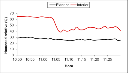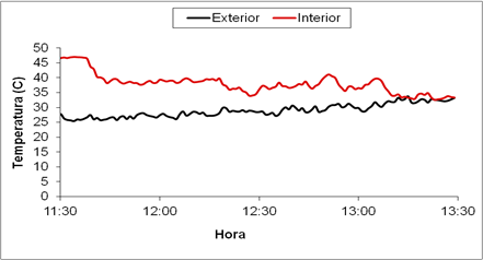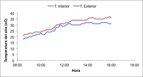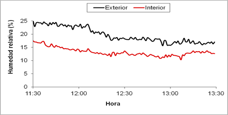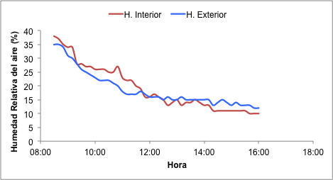 In the Figure 13 shows the temperature of the air inside and outside, obtaining a difference ΔT= 3.0 °C on average, with a standard deviation of 1.1 °C and in Figure 14, the relative air humidity conditions are shown in both media, where it is observed that ventilation has more influence on the characteristics of the microclimate compared to shading.