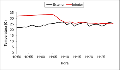 When the tomato crop is in full production, with a height of 2 m and zenithal and lateral windows are opened, the air exchange is of N= 13.32 h-1, with R2= 0.96, practically the temperature of the interior reaches to equalize the external air temperature in a period of 4 to 5 min, while the indoor air humidity is higher due to the evapotranspiration of the plants (Figures 6, 7 and 8).