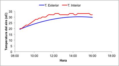Ventilation is one of the most important means available in a low-tech greenhouse for the regulation of the microclimate, since it favors the exchange of air with the external environment, with which the temperature and humidity of the air are regulated and as a consequence, the concentrations of carbon dioxide and oxygen. In Figures 3 and 4, the conditions of temperature and relative humidity of the air are shown in a completely closed empty greenhouse in relation to the conditions of the air outside. It is observed that the confined air reaches an average temperature of 46.34 °C, when outside, the average air temperature is 25.90 °C, an average temperature difference of 20.44 °C, while the relative humidity in the interior is lower 8%, which the greenhouse converts the external environment from dry warm to a desert type microclimate.