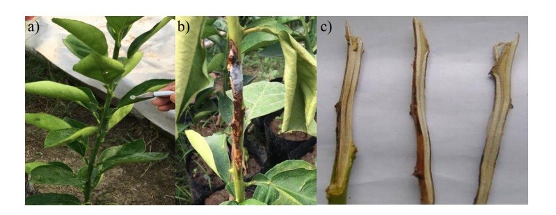 Figure 1 Pathogenicity test of fungi causing regressive death in sweet orange (C. sinensis L.). a) inoculation with mycelium discs; b) symptoms of regressive death; and c) vascular beams of the stem.