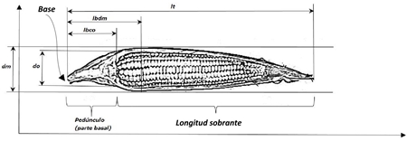 The geometric dimensions were measured in a single top view (Figure 1). The total length of each cob (lt), the largest diameter (dm) and the length of the base at it (lbdm) were determined. The length of the base to the optimal cutting area (lbco) and the optimal cutting diameter (do), was done by cutting each cob in a transverse way to visualize the peduncle and measure it with the measuring tape.