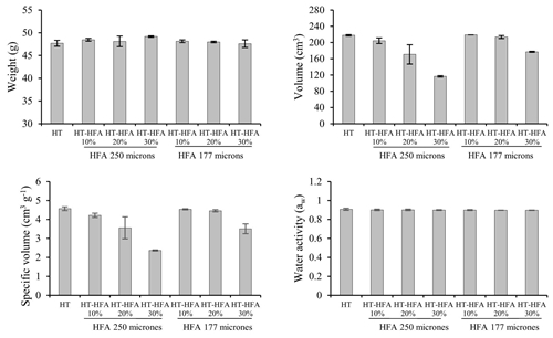 Figure 2 Weight (g), volume (cm3), specific volume (cm3 g-1) and water activity (aw) of bread obtained from wheat flour (HT) and flours replaced with oat fiber meal (HFA) in different percentages with different particle size.
