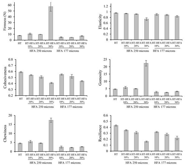 The texture profile of the loaves obtained is presented in Figure 3. This analysis is a technique that tries to use common bases for the subjective and objective methods used to estimate the quality associated with palatability/chewiness. Breads with lower or softer firmness values were obtained when 177 µm HFA was used in the replacement of HT in the 3 different % substitution (4.86, 4.71 and 7.05 N, respectively), otherwise this happened when 250 µm HFA was used, the above was more evident when the substitution occurred at 30% (57.39 N).